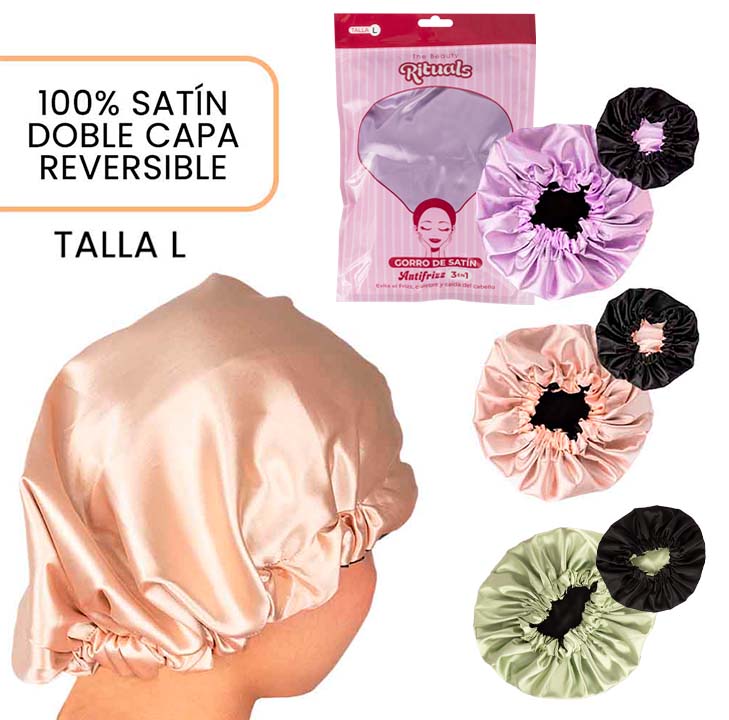 Gorro de satín en talla L con moño decorativo, ideal para proteger el cabello mientras duermes o durante tu rutina de cuidado capilar. Ayuda a reducir el frizz, evitar el quiebre y conservar la hidratación natural del cabello, manteniéndolo suave y manejable. Perfecto para cabellos largos o con volumen.