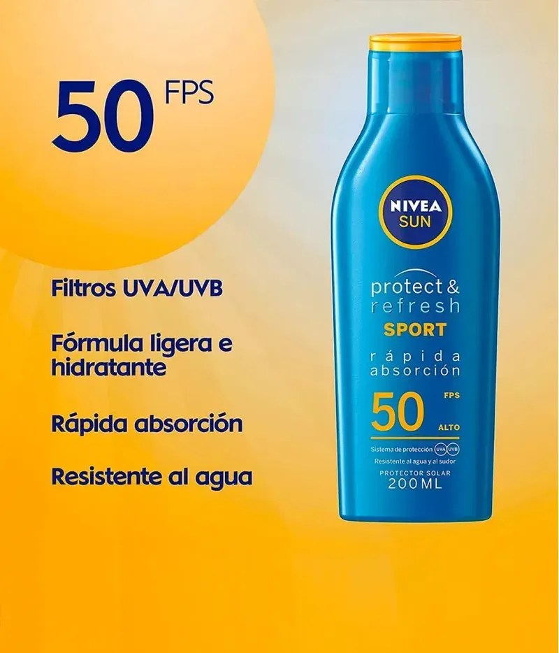 El Protector Solar SPF50 Protect & Refresh 200ml de NIVEA ofrece una protección solar de amplio espectro contra los rayos UVA y UVB, ayudando a prevenir el envejecimiento prematuro y las quemaduras solares. Su fórmula ligera y no grasa se absorbe rápidamente, dejando una sensación refrescante en la piel. Es resistente al agua y al sudor, lo que lo hace ideal para actividades al aire libre. Además, es adecuado para todo tipo de piel y ha sido dermatológicamente probado.