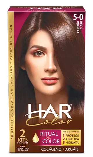 Tono 5-0 Castaño Claro. ¡Es ideal para mujeres de piel clara y ojos claros!- La coloración de HAR Color es única porque protege tu cabello de manera natural, gracias a su fórmula que contiene cristales de color con colágeno y óleos de argán que hidratan, fortalecen y acondicionan tu cabello.