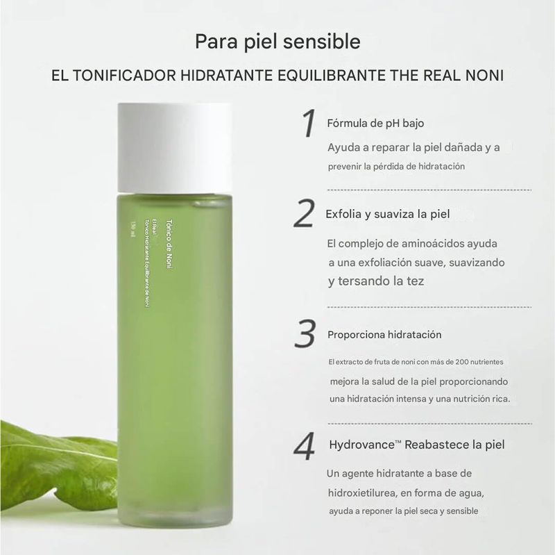 Un tónico suave y refrescante con infusión de extracto de fruta de noni calma eficazmente la piel, mientras que los abundantes nutrientes del noni proporcionan una tez vibrante y radiante
